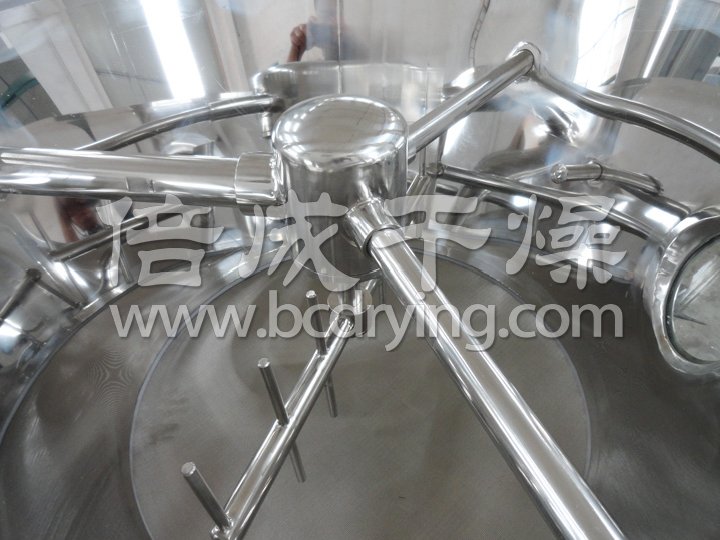 空氣經(jīng)加熱凈化后,由引風(fēng)機從下部導(dǎo)入,穿過料斗的孔網(wǎng)板。在工作室內(nèi),經(jīng)攪拌和負(fù)壓作用形成流態(tài)化,水份快速蒸發(fā)后隨著排氣帶走,物料快速干燥。