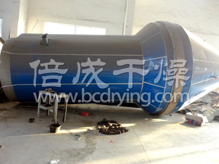 本機(jī)組工作過程為料液通過隔膜泵高壓輸入,噴出霧狀液滴,然后同熱空氣并流下降,大部分粉粒由塔底排料口收集,廢氣及其微小粉末經(jīng)旋風(fēng)分離器分離,廢氣由抽風(fēng)機(jī)排出,粉末由設(shè)在旋風(fēng)分離器下端的授粉筒收集,風(fēng)機(jī)出口還可裝備二級(jí)除塵裝置,回收率在96-98%以上。