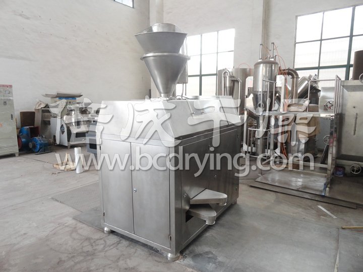 擠壓造粒的形式可以有對(duì)輥式和輪輾式兩種,對(duì)輥式擠壓是先壓成大塊,再破碎成顆粒,這樣裝置的能力大、顆粒強(qiáng)度高、能耗低,對(duì)輥擠壓在國(guó)外使用廣泛。輪輾式是在輥表面直接做成有穴槽型的形狀,一次擠成成型顆粒。產(chǎn)品強(qiáng)度較低有時(shí)需添加粘結(jié)劑。適合做有機(jī)肥和復(fù)合肥等顆粒肥料。